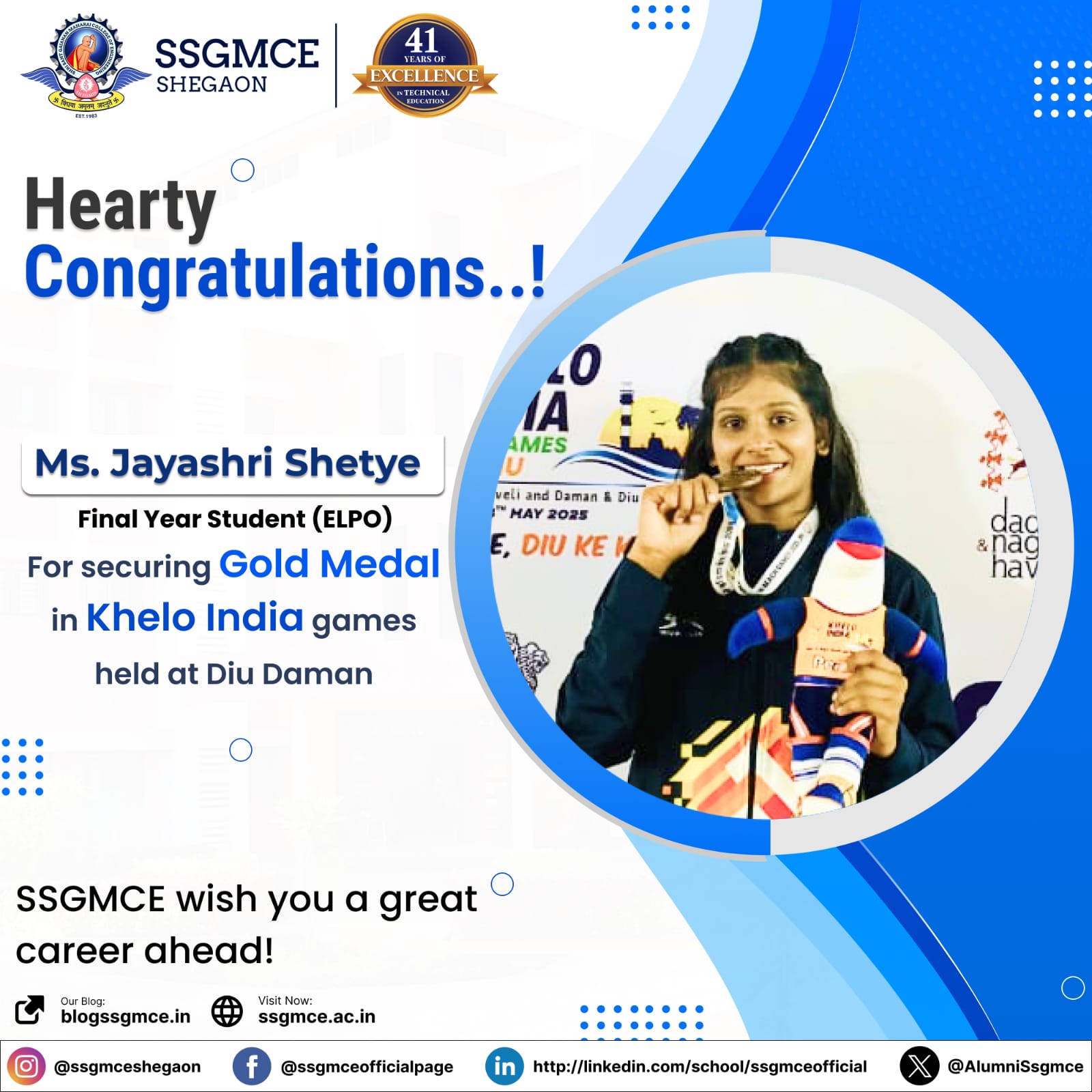 Jayashri Shetye, a final-year Electrical Engineering student of SSGMCE, Shegaon, has brought immense pride to the institute by clinching a gold medal at the Khelo India Games held in Diu and Daman from May 19 to May 24, 2025.- 17