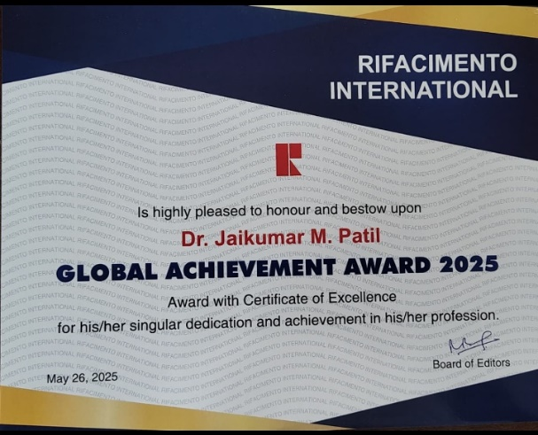 | Global Achievement Award 2025 | Dr. J. M. Patil Honored and bestow “Global Achievement Award 2025” at rifacimento International |