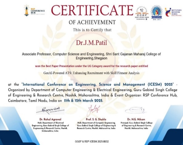 | Awarded as Best Paper | Dr. J. M. Patil Awarded as Best Paper in ICESM 2025 Conference, Nashik, Maharashtra |