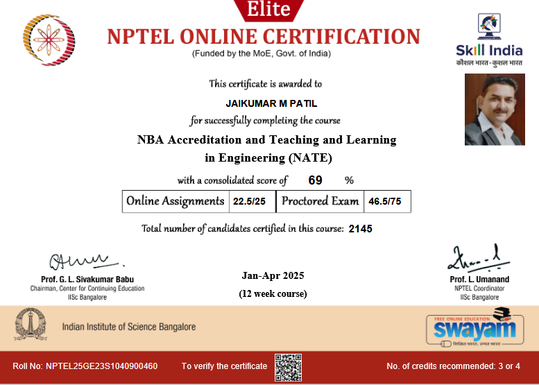 | NPTEL Certification | Dr. J. M. Patil Successfully Completed NBA Accreditation and Teaching and Learning in Engineering (NATE) with score of 69% in Elite Category. |