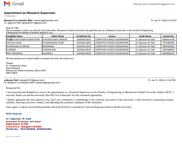 | Appointed as Research Supervisor | Dr. J. M. Patil Appointed as Research Supervisor at the Mansarovar Global University, Sehore (M.P). |