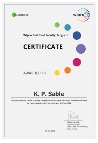 | Wipro certified faculty | Prof K. P. Sable Awarded certificate as Wipro certified faculty |