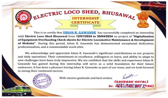 | Successfully completed a project during an internship at the Electric Loco Shed, Bhusaval | Kamlesh Kasambe Bhuwanesh Kale Janvi Nakat |