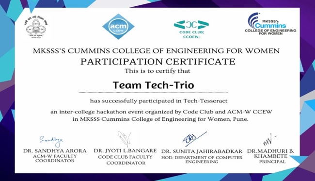| First Prize in Second year category Tech-Tesseract HACKATHON by Code Club & ACM -W CCEW | Om Kadu Subodh Munghate Anagha Badhe a third-year student in the Computer Science and Engineering program at SSGMCE |