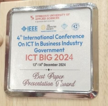 | Best Paper Presentation Award | Dr. R. A. Zamare Received the Best Paper Presentation Award at the 4th International Conference on ICT in Business, Industry, and Government (ICTBIG 2024), organized by Symbiosis University of Applied Sciences, Indore. |