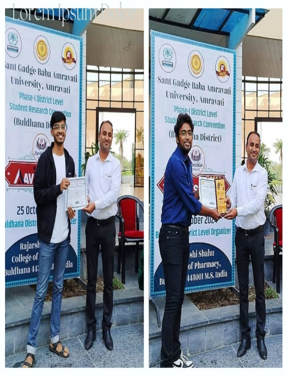 | First Position for their Co-Carr Project | Piyush Agroya(3R) and Anikesh Gadekar(4R) Received the First Position for their Co-Carr Project at the district-level Avishkar Project Competition held on 25th OCT, 2024, at Rajarshi Shahu College of Pharmacy, Buldhana |