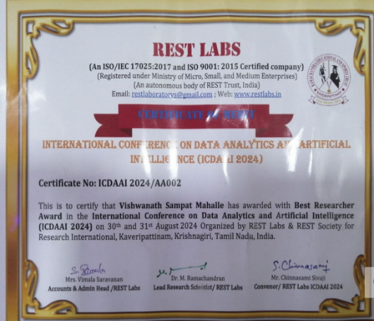 | Best Researcher Award | Prof. V. S. Mahalle Honored with the Best Researcher Award at the International Conference on Data Analytics and Artificial Intelligence (ICDAAI 2024), held on August 30–31, 2024. |