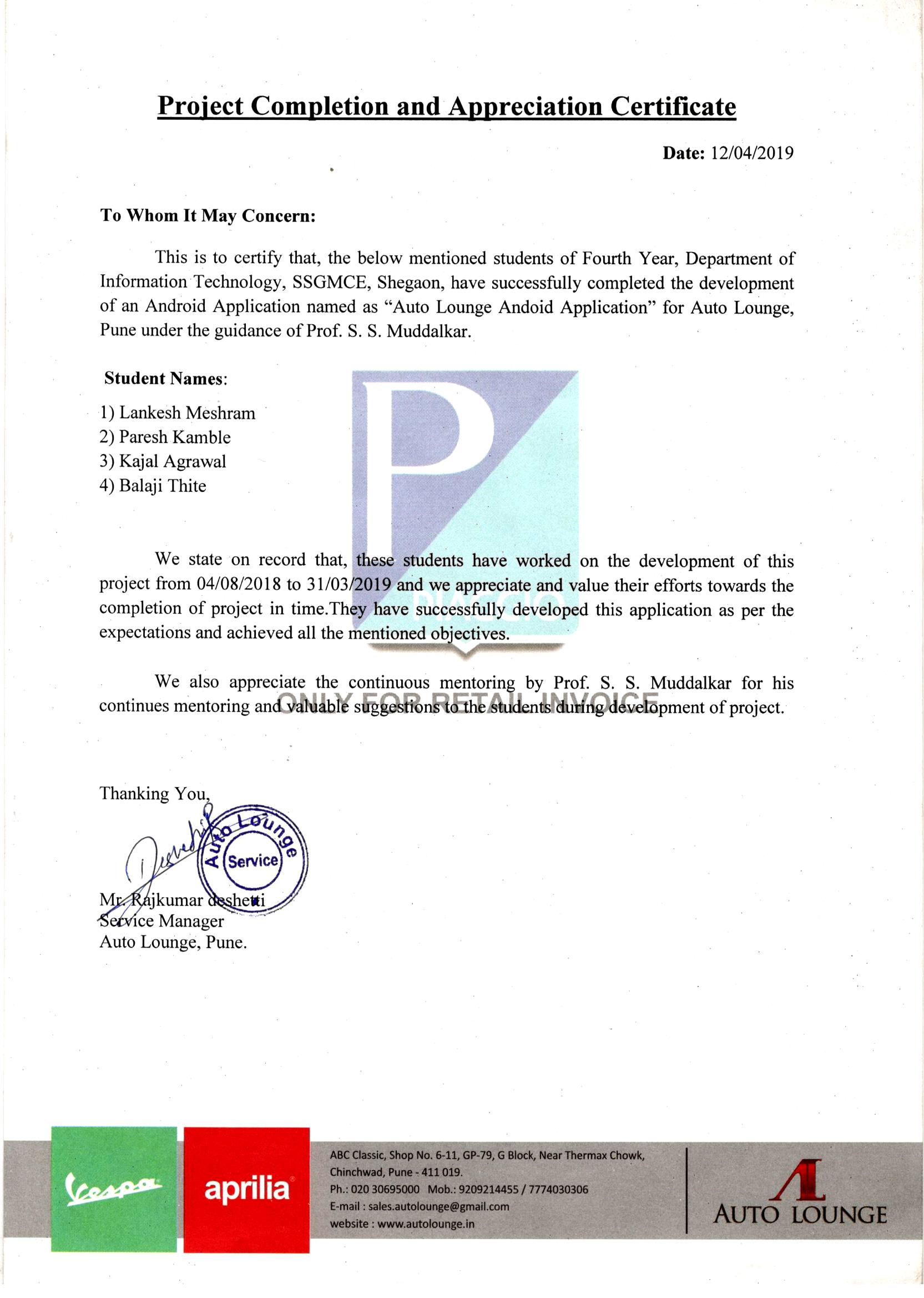 | Project Completion and Appreciation Certificate | Prof. S. S. Muddalkar received a letter of appreciation from Auto Lounge, Pune on 12-April-2019. | View Certificate |
