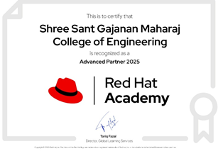 | Red Hat Learning Academy is Recognised as Advanced Learning Partner for year 2025 | Prof. Mrs. S. N. Khandare The Red Hat Academy Coordinator effectively led academic planning, certification drives, and student engagement activities, resulting in a significant increase in student certifications. These sustained efforts contributed to the institution being recognized as a Red Hat Academy Advanced Partner 2025. | View Certificate |