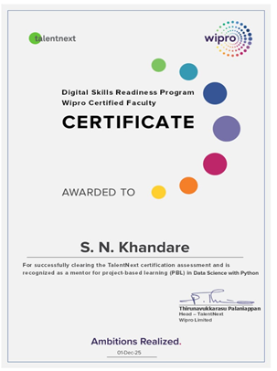 | Wipro Certified Faculty | Prof. Mrs. S. N. Khandare has successfully cleared the TalentNext Certification assessment and is recognized as a Mentor for project based learning(PBL) in Data Science with Python 8 Dec 2025 | View Certificate |