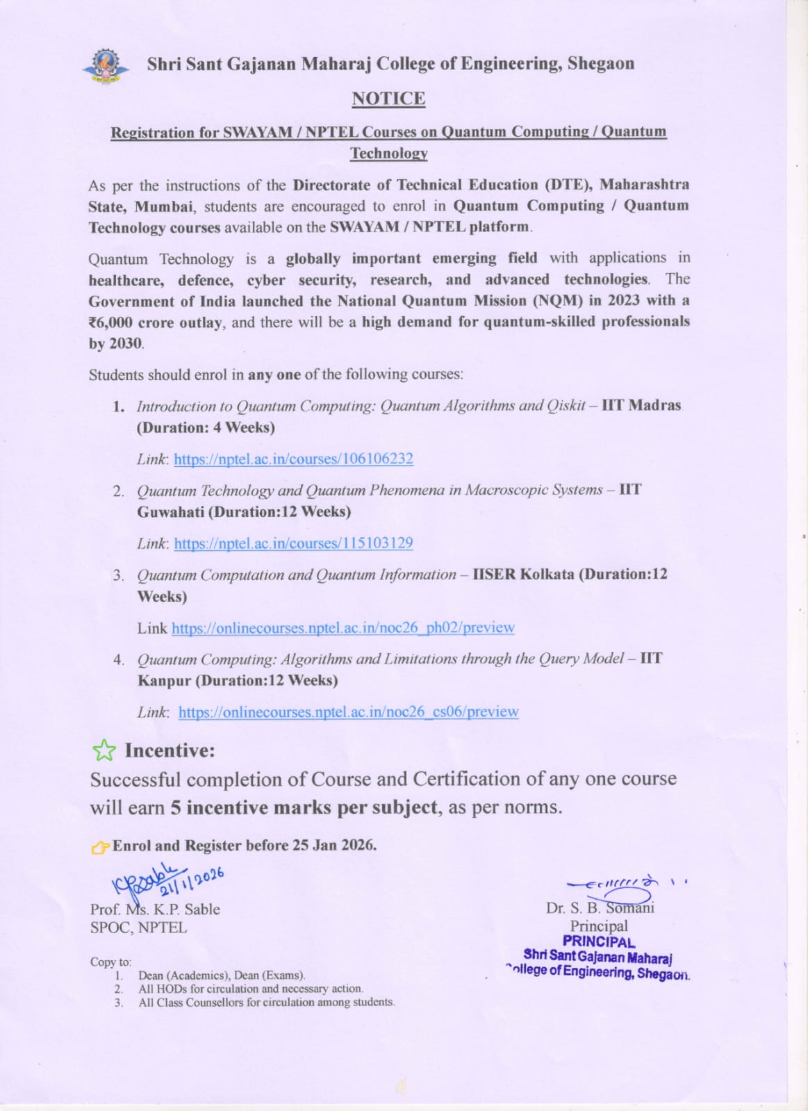 Students are informed that registration is now open for SWAYAM/NPTEL online courses on Quantum Computing / Quantum Technology for details kindly go through the attachment.- 04