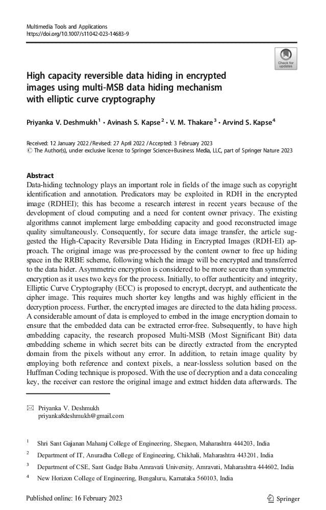| Paper Published in SCI Journal | Prof. P.V. Deshmukh published paper titled on High-capacity reversible data hiding in encrypted images using multi-MSB data hiding mechanism with elliptic curve cryptography in Multimedia Tools and Applications https://doi.org/10.1007/s11042-023-14683-9 | ![]() |