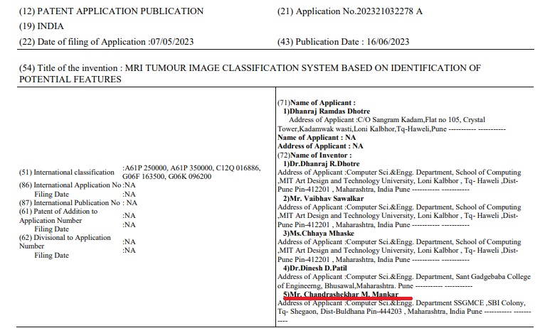 | Patent Published | Prof. C. M. Mankar published patent on MRI TUMOUR IMAGE CLASSIFICATION SYSTEM BASED ON IDENTIFICATION OF POTENTIAL FEATURES | ![]() |
