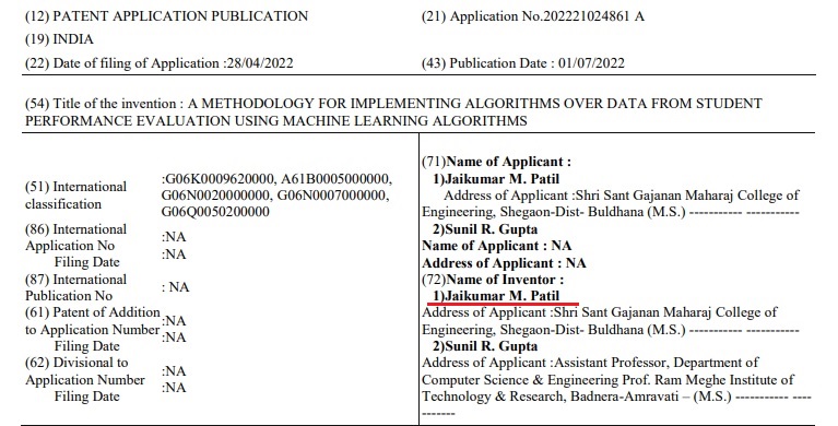 | Patent Published | Dr. J. M. Patil published patent on A METHODOLOGY FOR IMPLEMENTING ALGORITHMS OVER DATA FROM STUDENT PERFORMANCE EVALUATION USING MACHINE LEARNING ALGORITHMS | ![]() |
