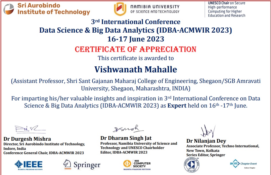 | Certificate of Appreciation | Prof. V.S. Mahalle Invited as a Reviewer in 3rd International Conference on Data Science & Big Data Analytics (IDBA-ACMWIR 2023)held on 16th -17th June. | ![]() |