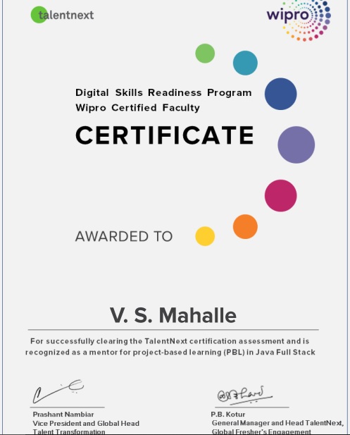 | Wipro Certified Faculty | Prof. V.S. Mahalle awarded as Wipro certified faculty for Project base learning for JAVA full stack | ![]() |