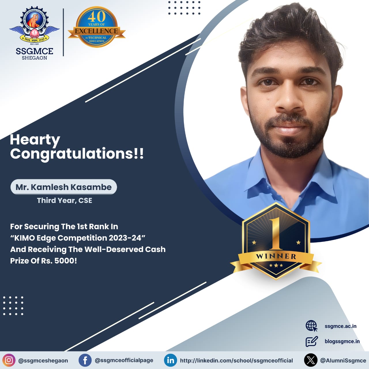 | Secured First Rank | Kamlesh Kasambe 3rd Year Student of Computer Science and Engineering Department Secured First Rank in KIMO Edge Competition and receive cash prize of 5000/- Rs. | ![]() |
