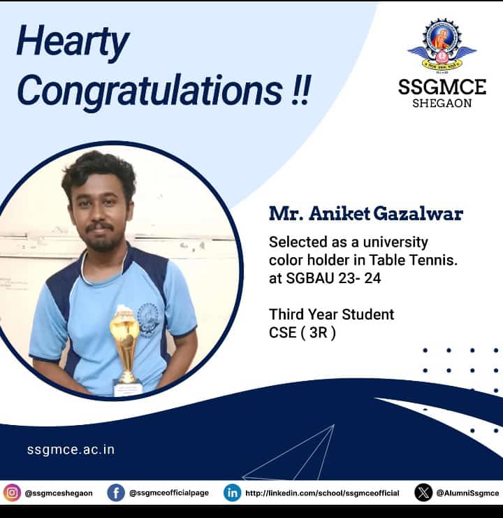 | University Color Holder | Aniket Gazalwar 3rd Year Student of Computer Science and Engineering Department Selected as a University Color Holder in Table Tannis | ![]() |