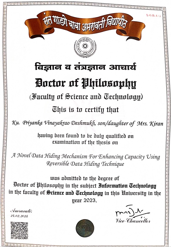 | Ph.D. Award | Prof. P. V. Deshmukh successfully completed his Ph.D. degree in Computer Science and Engineering from Sant Gadage baba Amravati University, Maharashtra, India. | ![]() |