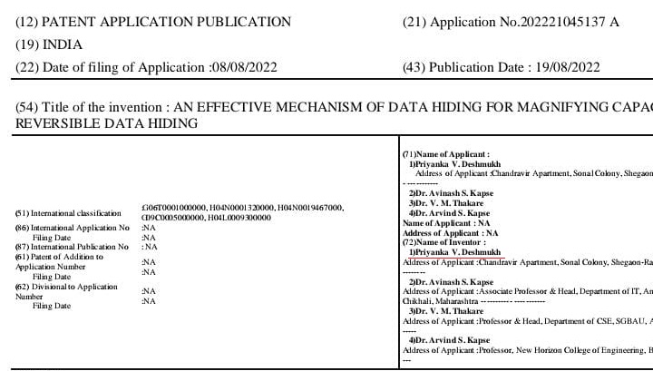 | Patent Published | Prof. P. V. Deshmukh published patent on AN EFFECTIVE MECHANISM OF DATA HIDING FOR MAGNIFYING CAPACITY USINGREVERSIBLE DATA HIDING | ![]() |