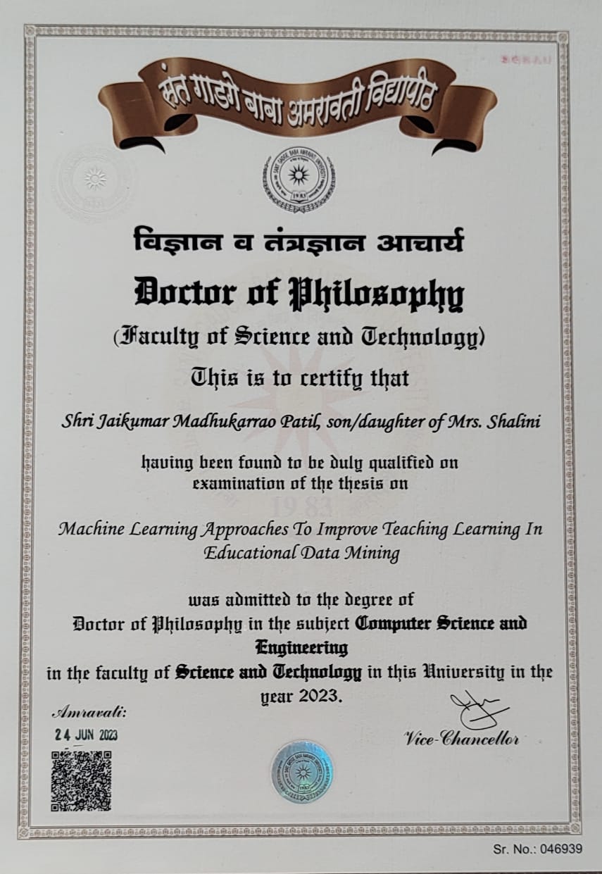 | Ph.D. Award | Prof. J. M. Patil successfully completed his Ph.D. degree in Computer Science and Engineering from Sant Gadage baba Amravati University, Maharashtra, India. | ![]() |