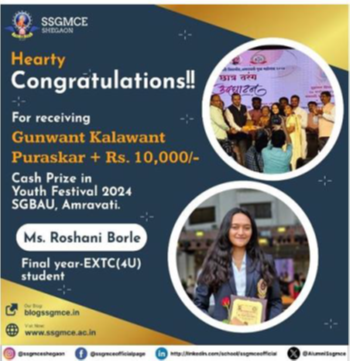 Miss Roshni Borle won second prize during Indradhanushya 2023-24! She was a part of SGABU, Amravati Team participating in the State Level Inter-University Youth Festival held at Dr. Babasaheb Ambedkar Marathwada University (Bamu), Chhatrapati Sambhaji Nagar. |