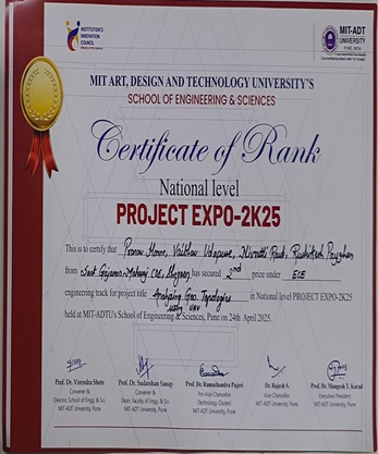Mr. Rajat Kiran Patil and Miss. Janhavi Ghamsham Patil received First Prize and certificate under the category of Software in Technovation24 oragnized by Godavari College of Engineering Jalgaon Amravati.(3rd April 2024) |